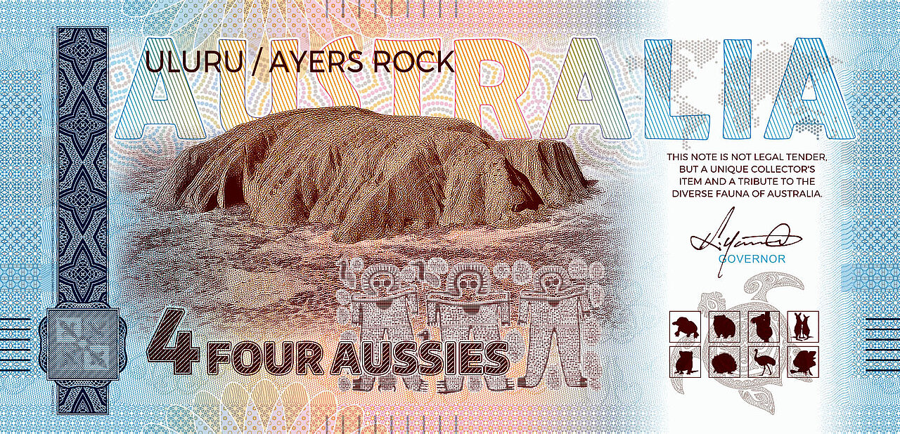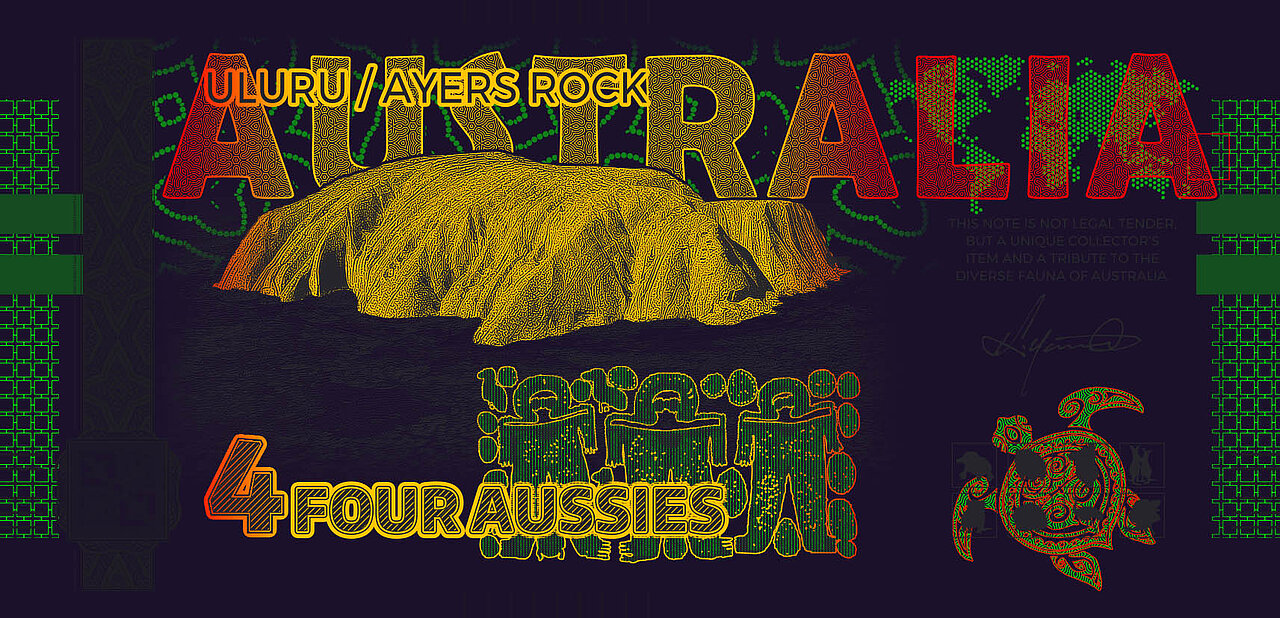 Reverse: Uluru or Ayers Rock, sandstone formation in Central Australia, Aboriginal art, stylized sea turtle