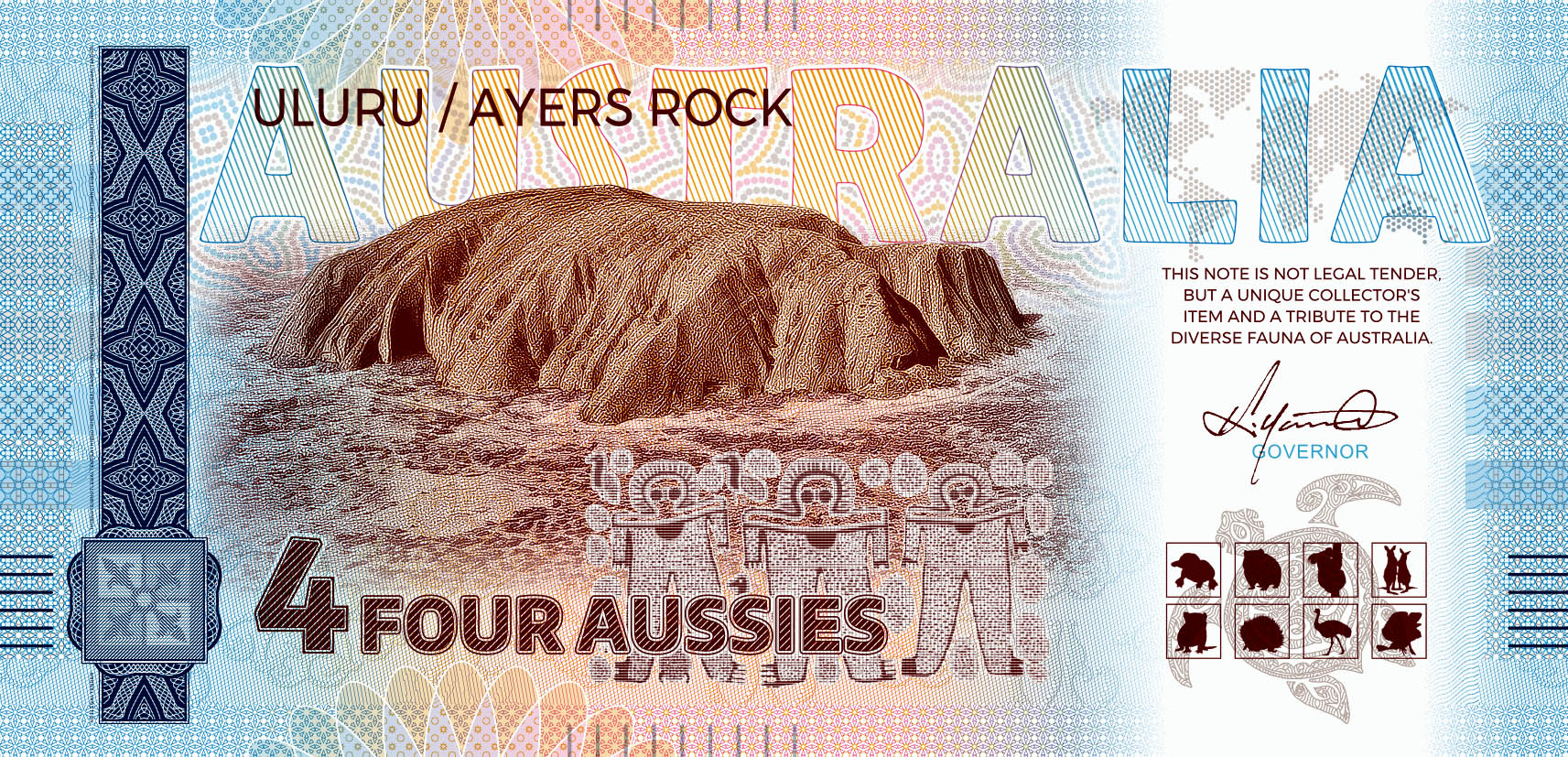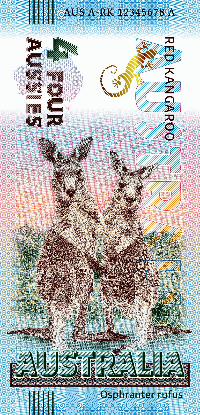 This special souvenir note from the Australia Series is dedicated to the red kangaroo. Printed on genuine security paper, it features a lizard as a gold foil patch, motifs in UV color and haptic elements. While the vertically designed obverse depicts two kangaroos, the reverse shows the famous sandstone formation Uluru or Ayers Rock in Central Australia and Aboriginal art. Uluru is 348 m (1,142 ft) high and is revered as a sacred place by the Aboriginal people of the area. Under UV light, a road sign with a kangaroo becomes visible. The Australia Series, which comprises a total of eight souvenir notes, is also available in a booklet with lots of information and pictures.