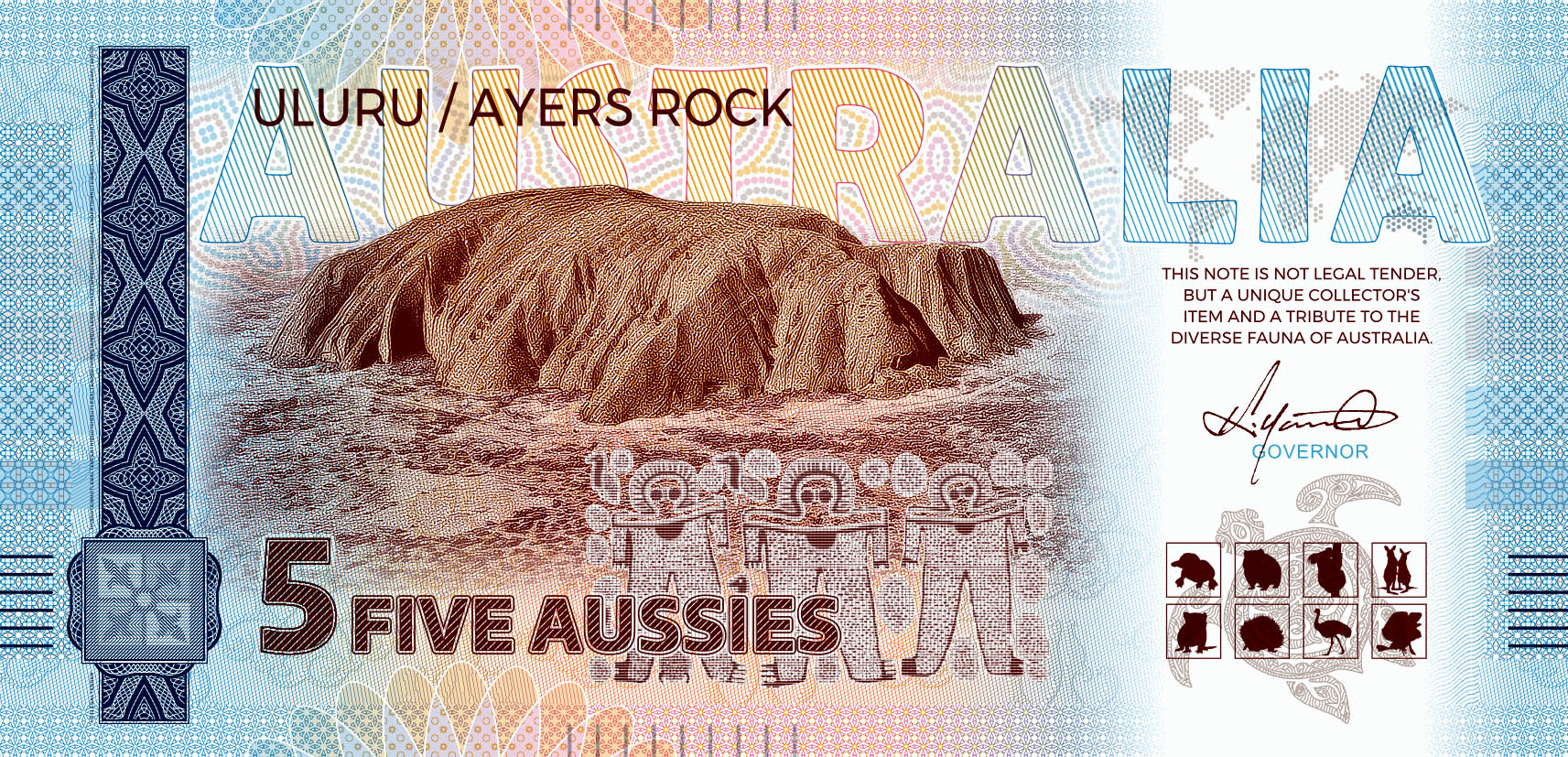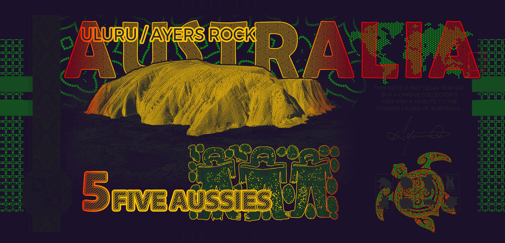 This special souvenir note from the Australia Series is dedicated to the Tasmanian devil. Printed on genuine security paper, it features a lizard as a gold foil patch, motifs in UV color and haptic elements. While the vertically designed obverse depicts a Tasmanian devil, the reverse shows the famous sandstone formation Uluru or Ayers Rock in Central Australia and Aboriginal art. Uluru is 348 m (1,142 ft) high and is revered as a sacred place by the Aboriginal people of the area. Under UV light, a road sign with a Tasmanian devil becomes visible. The Australia Series, which comprises a total of eight souvenir notes, is also available in a booklet with lots of information and pictures.