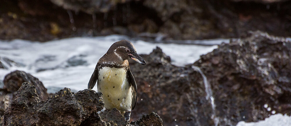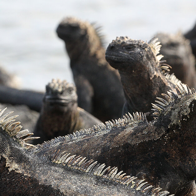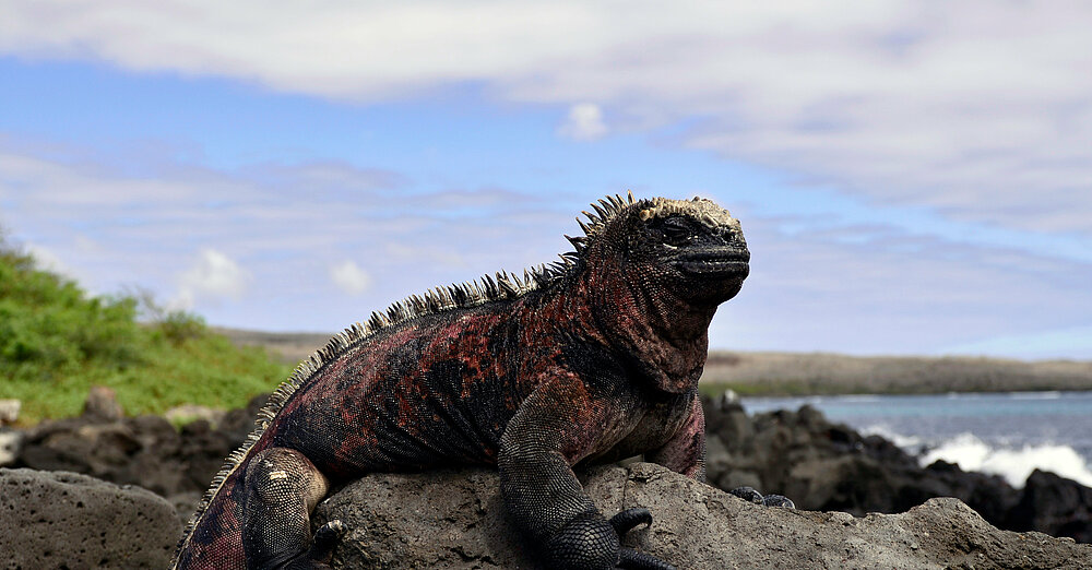 Galápagos is a group of volcanic islands in the eastern Pacific Ocean, about 900 km (560 mi) from the South American mainland. It belongs to the national territory of Ecuador and the province of the same name is home to about 30,000 inhabitants. Due to the geographical isolation and the confluence of three ocean currents, a unique diversity of endemic animal and plant species has developed on the Galápagos Islands. The archipelago comprises 13 larger islands of over 10 km² and more than 100 smaller ones. Five of the islands are inhabited: Baltra, Floreana, Isabela, San Cristóbal and Santa Cruz. At 4,586 km² (1,771 sq mi), Isabela is larger than all the other islands combined and, with its six volcanoes, is among the places with the highest volcanic activity in the world. One of them, Wolf Volcano, is the highest elevation in the Galápagos at 1,710 m (5,610 ft). It is located right on the equator.
