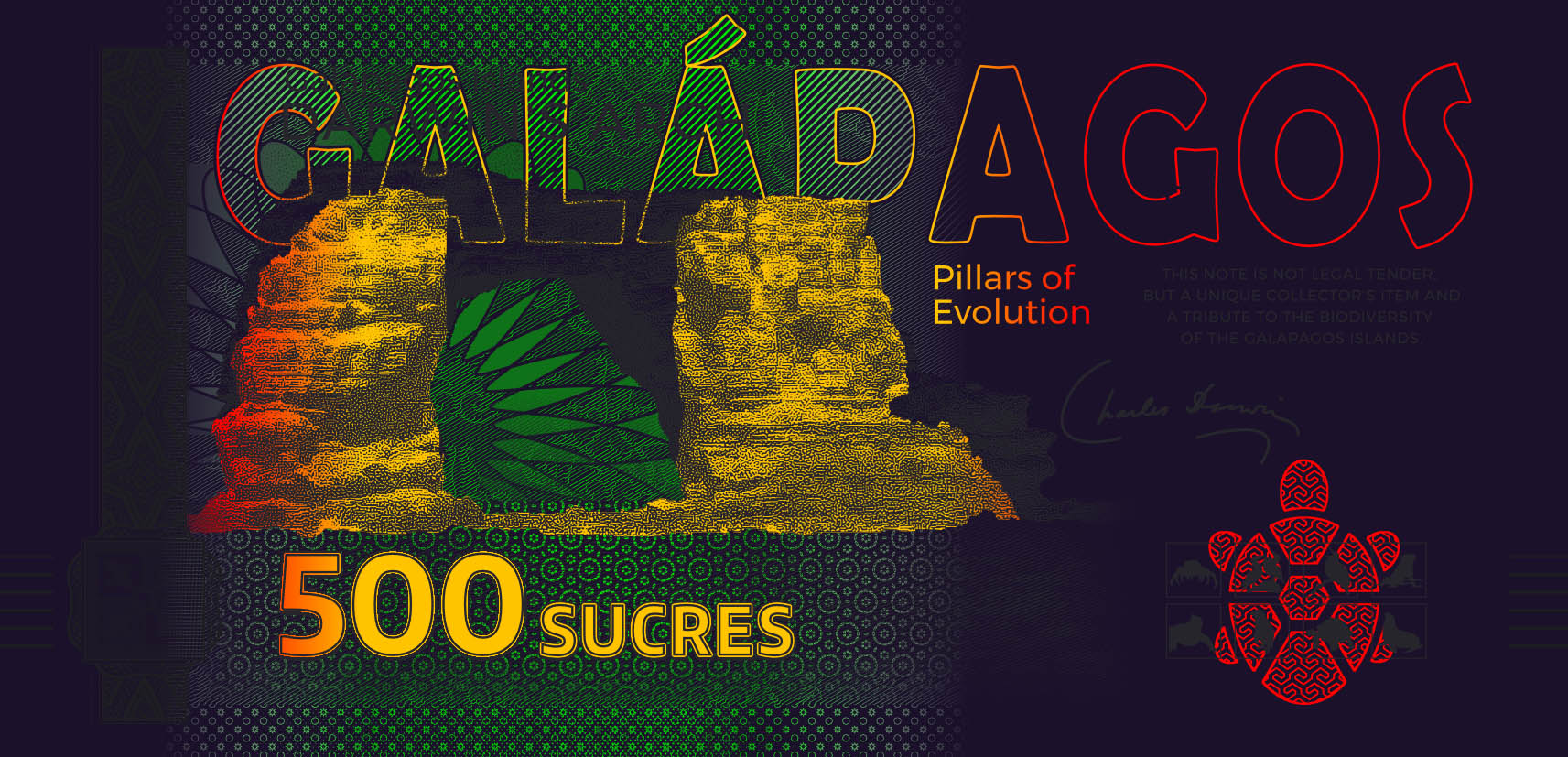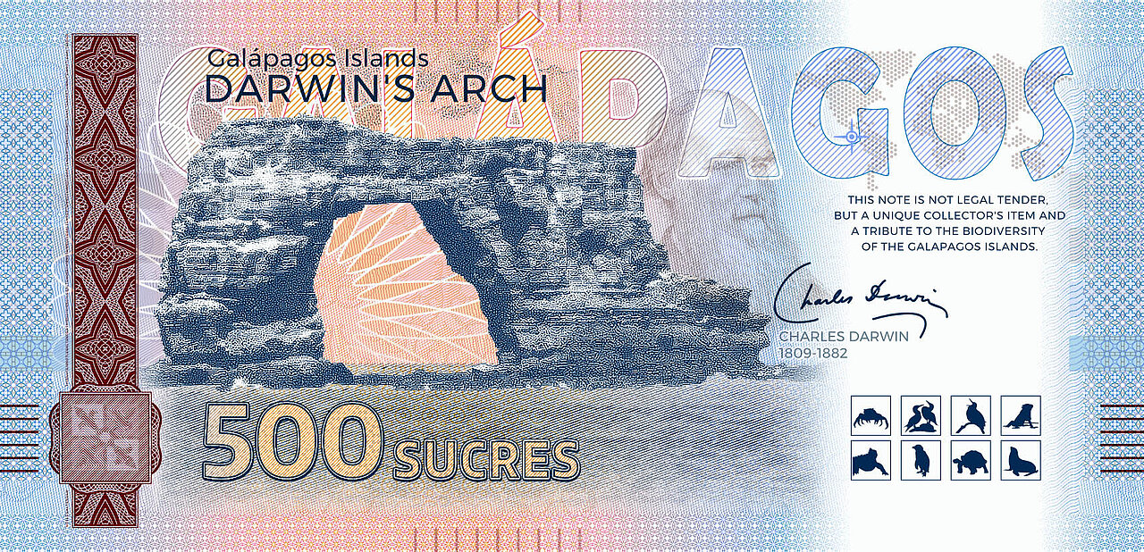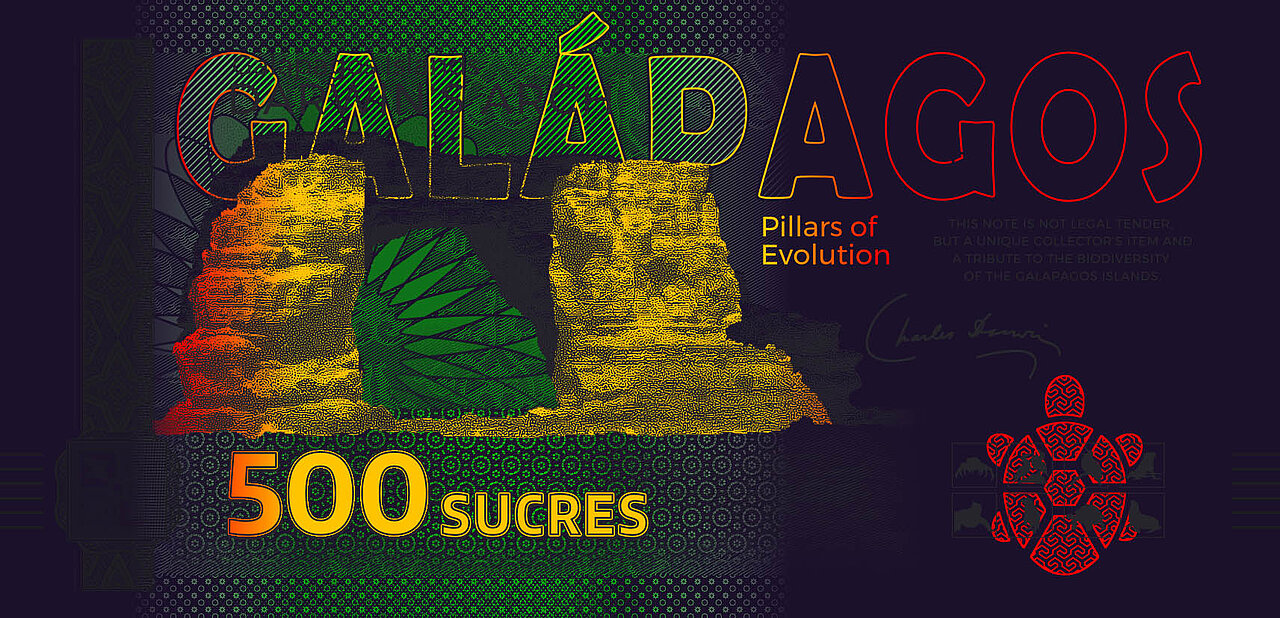 This souvenir note from the Galápagos Series is dedicated to the Galápagos penguin. Printed on genuine security paper, it features a Galápagos tortoise as a gold foil patch, motifs in UV color and haptic elements. While the vertically designed obverse depicts two penguins, the reverse shows a portrait of Charles Darwin and Darwin's Arch before its collapse in 2021. Under UV light, the current appearance of the rock formation is visible. The Galápagos Series, which comprises a total of eight souvenir notes, is also available in a booklet with lots of information and pictures.