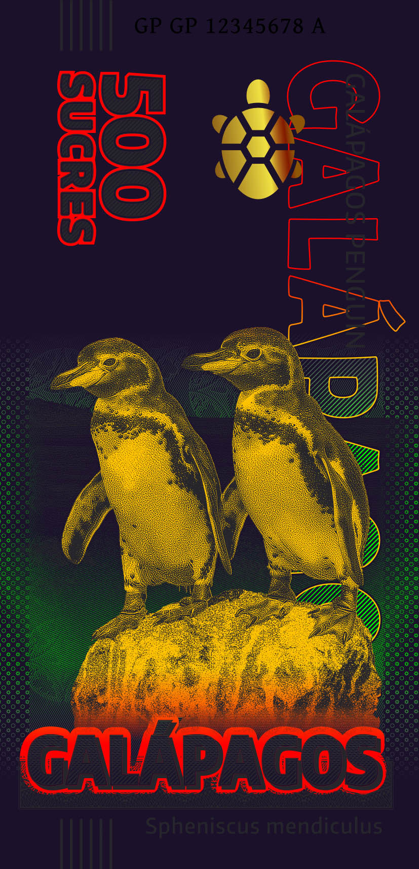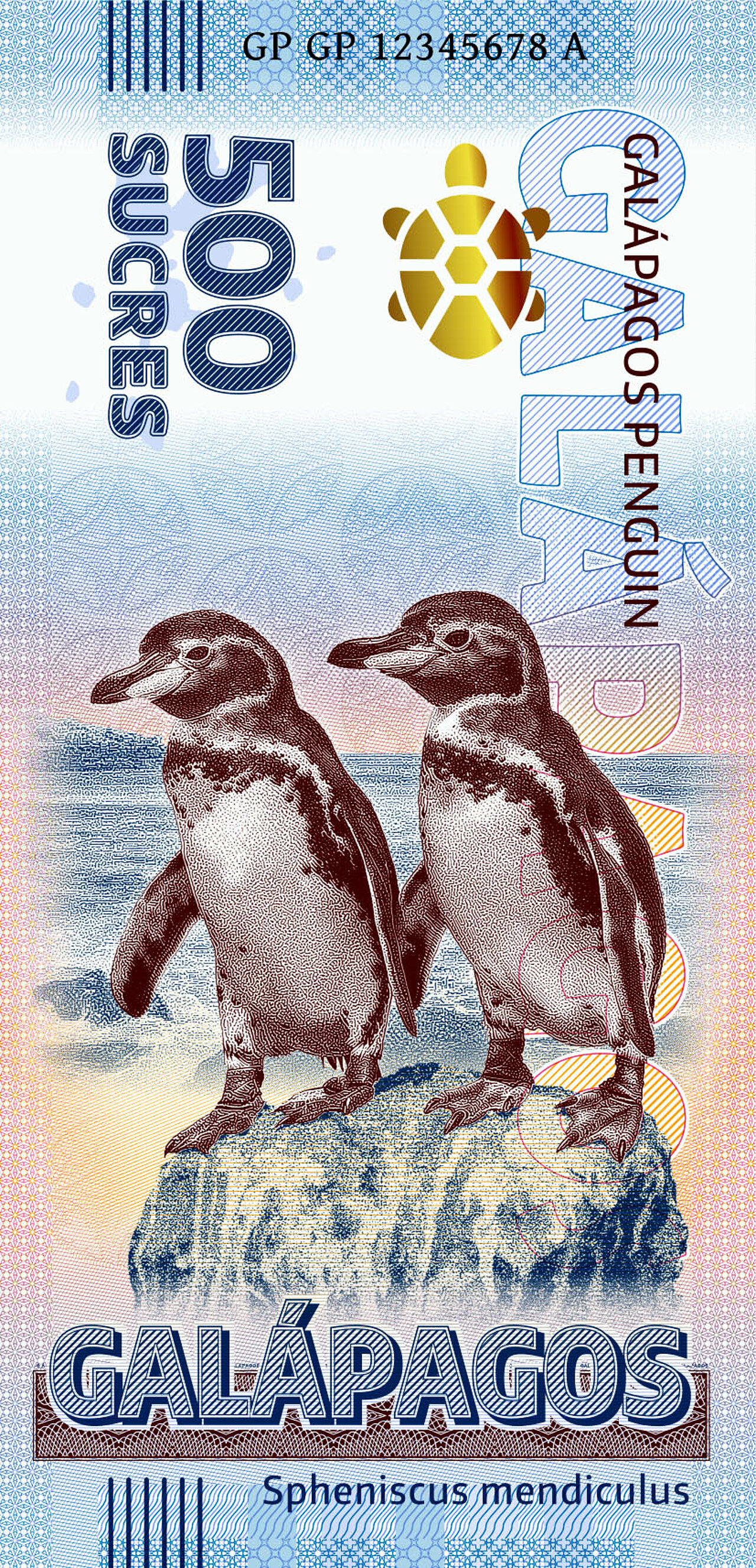 Obverse: Galápagos penguins, stylized Galápagos tortoise, map of the Galápagos Islands