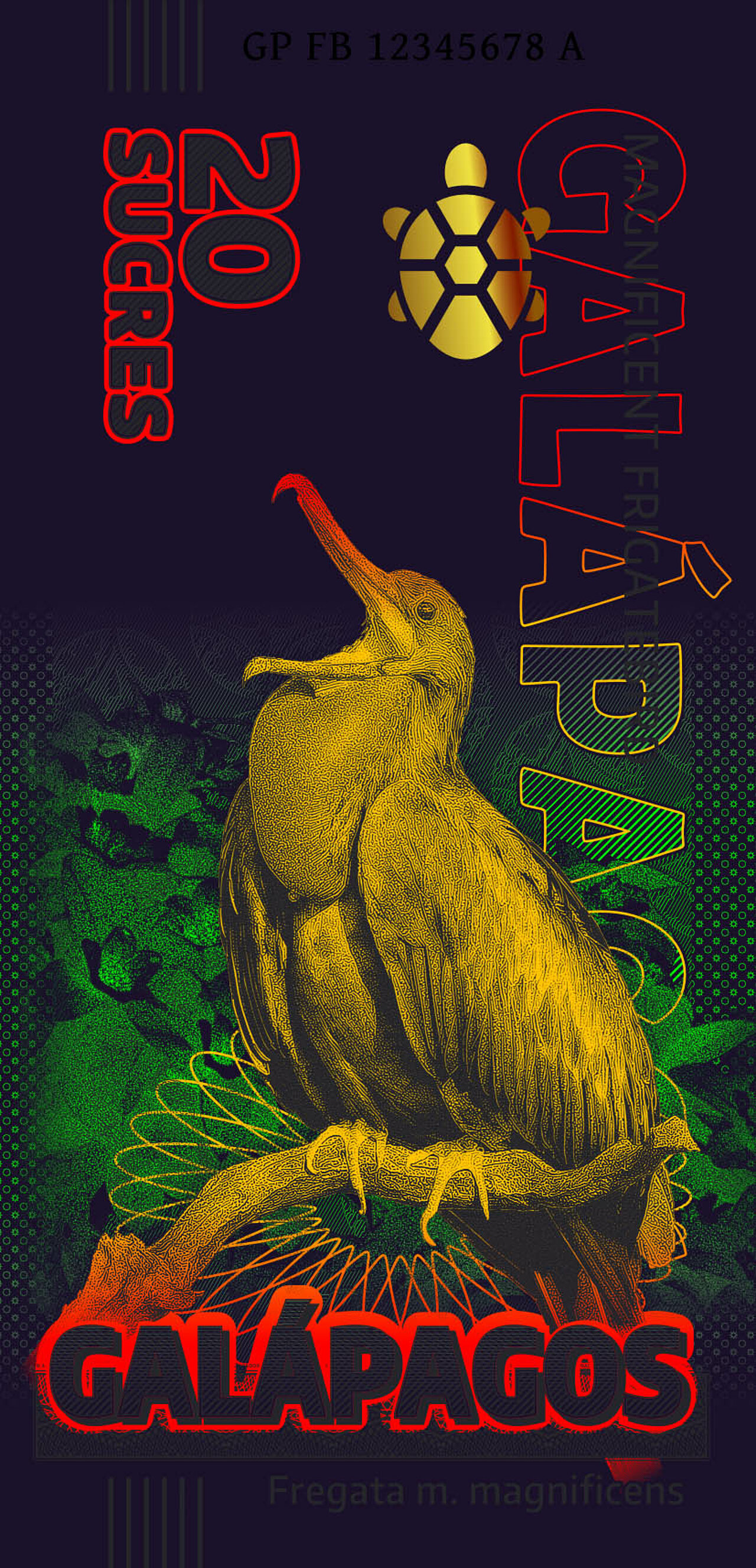 Obverse: Magnificent frigatebird, stylized Galápagos tortoise, map of the Galápagos Islands