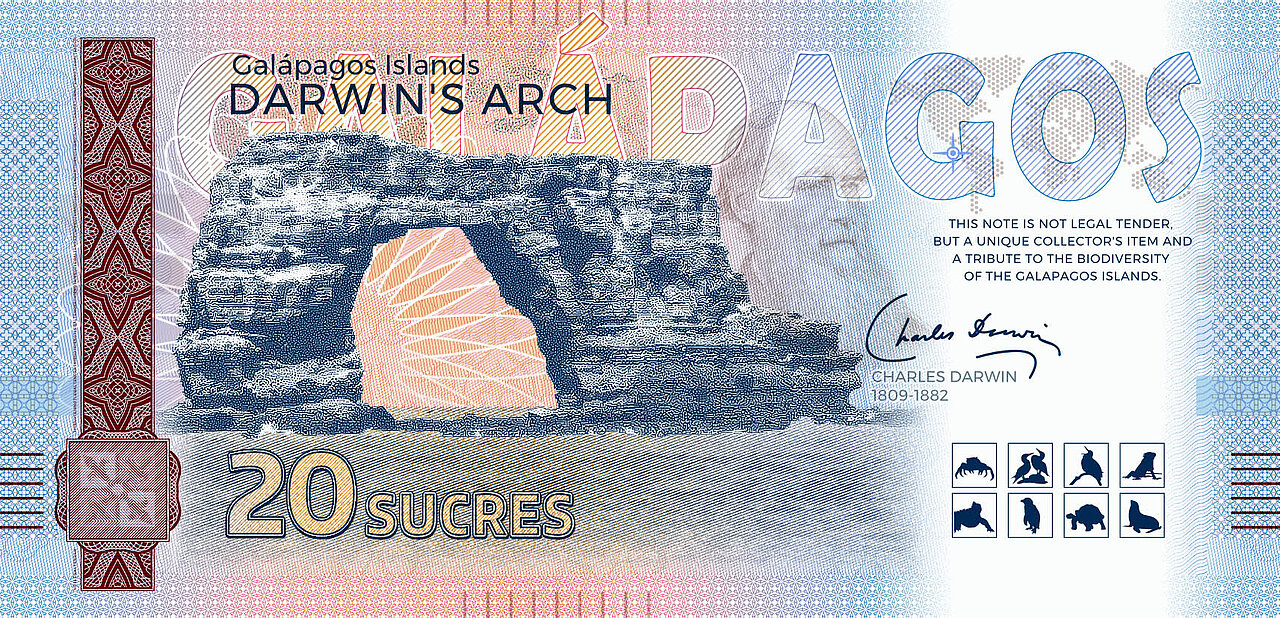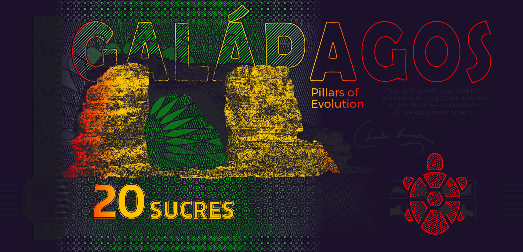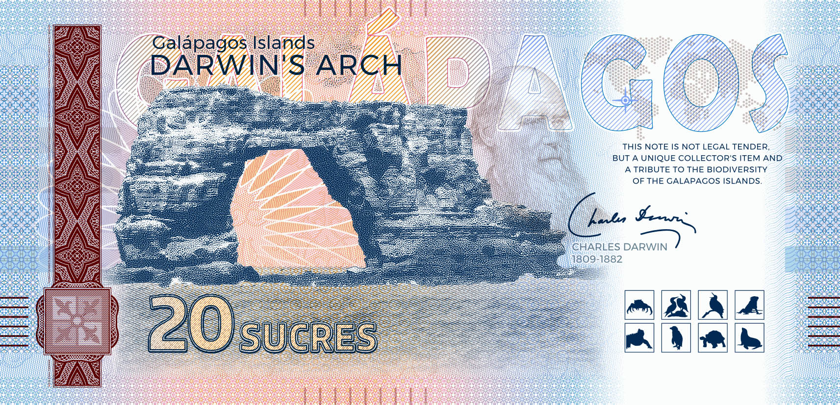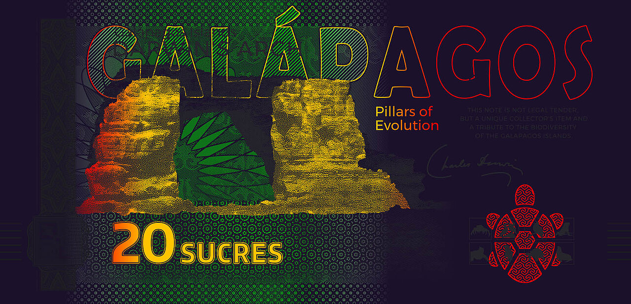 This souvenir note from the Galápagos Series is dedicated to the magnificent frigatebird. Printed on genuine security paper, it features a Galápagos tortoise as a gold foil patch, motifs in UV color and haptic elements. While the vertically designed obverse depicts a magnificent frigatebird, the reverse shows a portrait of Charles Darwin and Darwin's Arch before its collapse in 2021. Under UV light, the current appearance of the rock formation is visible. The Galápagos Series, which comprises a total of eight souvenir notes, is also available in a booklet with lots of information and pictures.