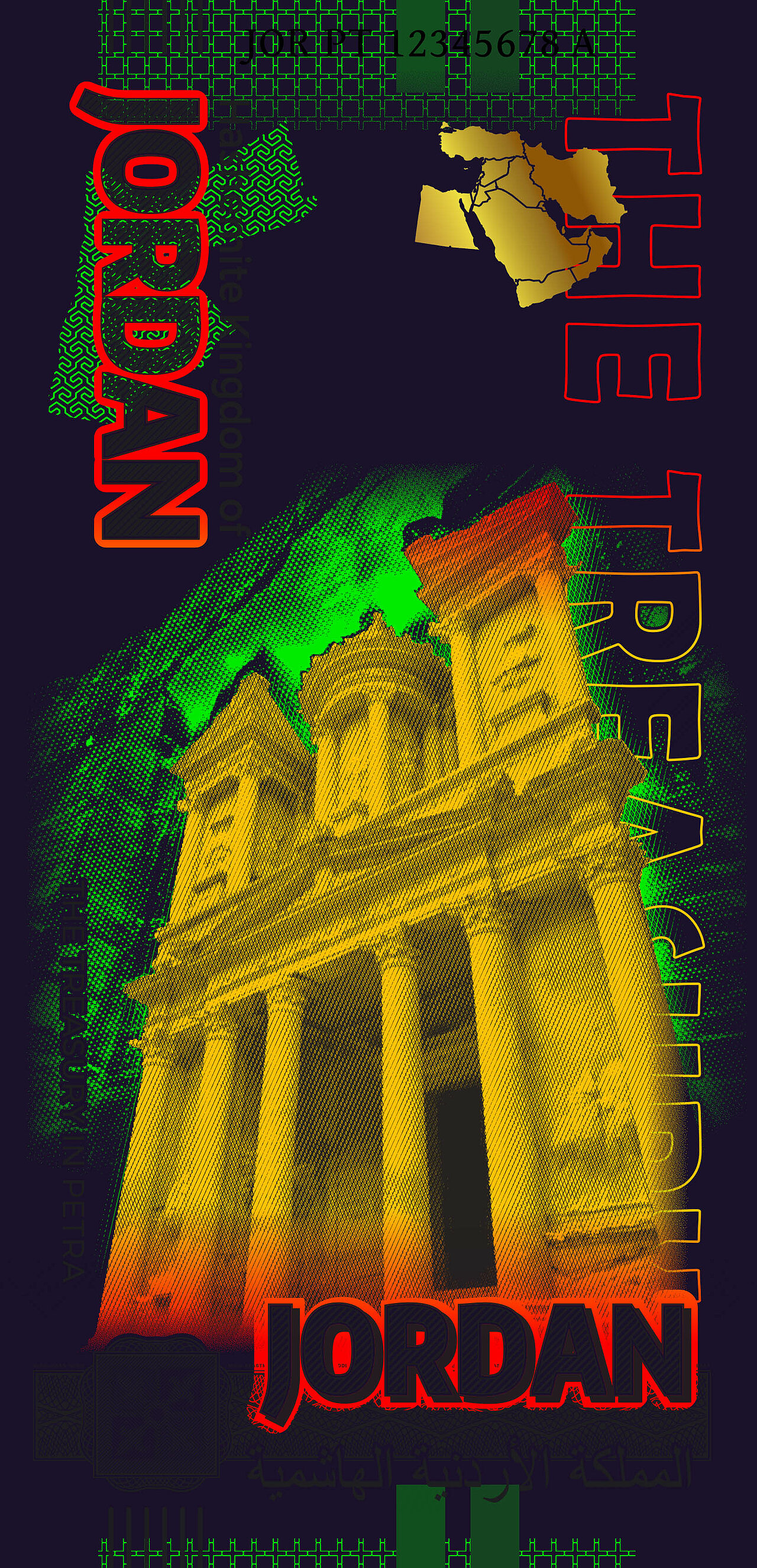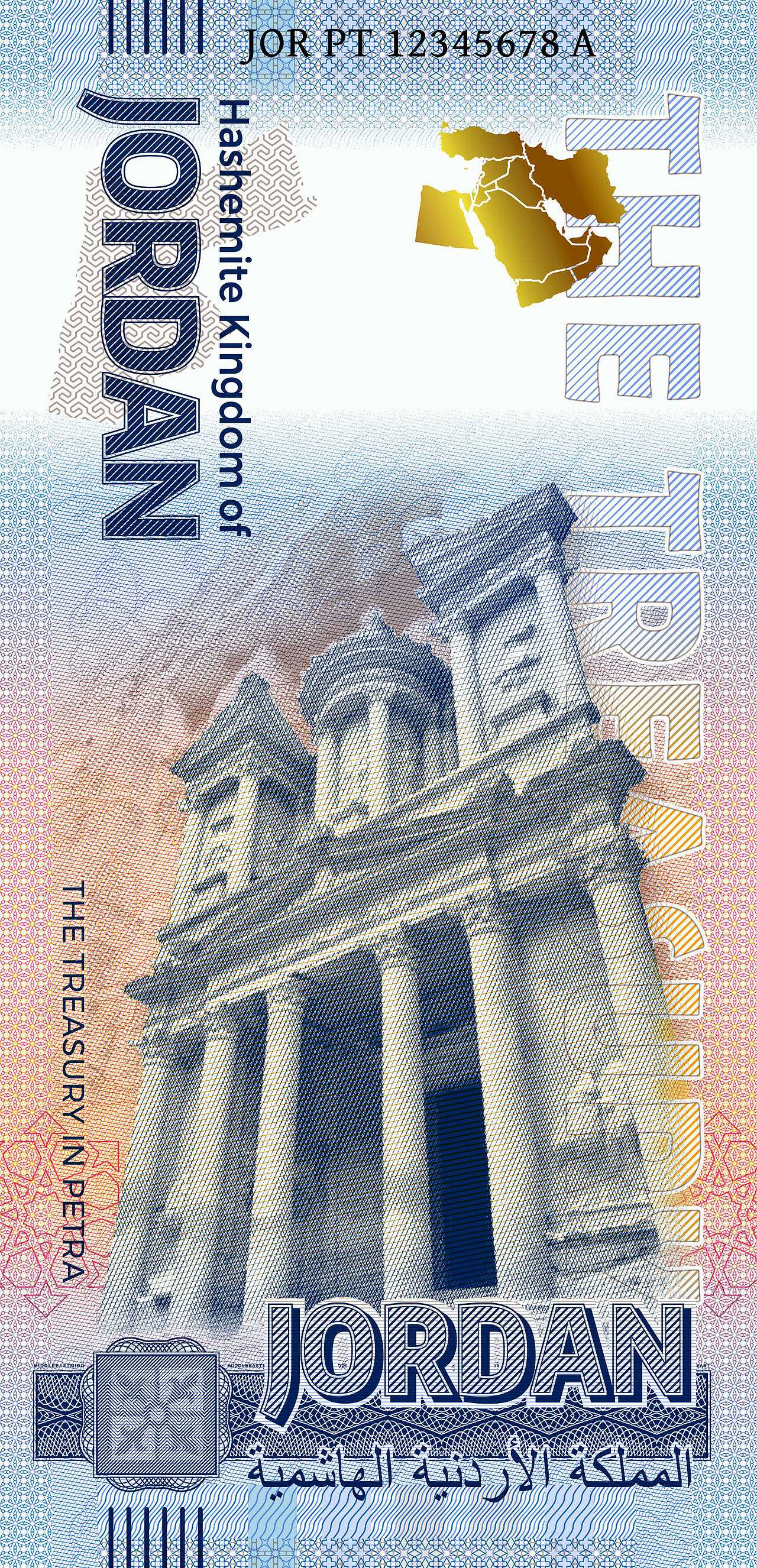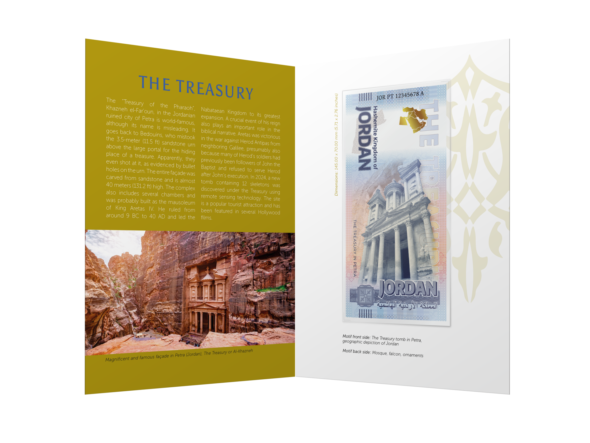 This unique souvenir note from the Middle East Series is dedicated to Jordan's famous historical heritage. It is printed on genuine banknote paper and has several modern security features such as a gold foil patch in the shape of a map of the Middle Eastern countries. The obverse is designed vertically and depicts “The Treasury” in Petra. The reverse shows a mosque and a falcon, the traditional heraldic animal of several Arab states.