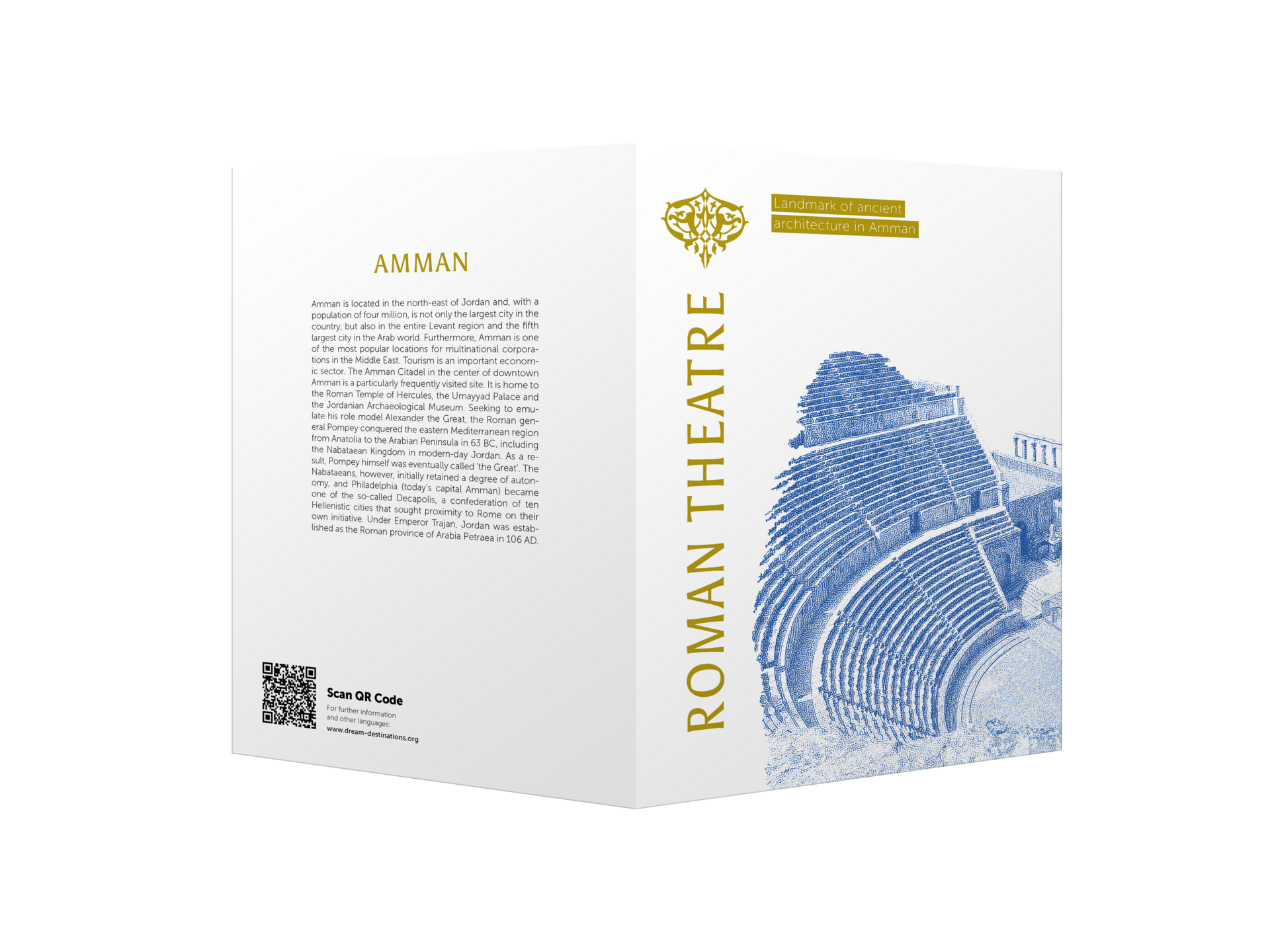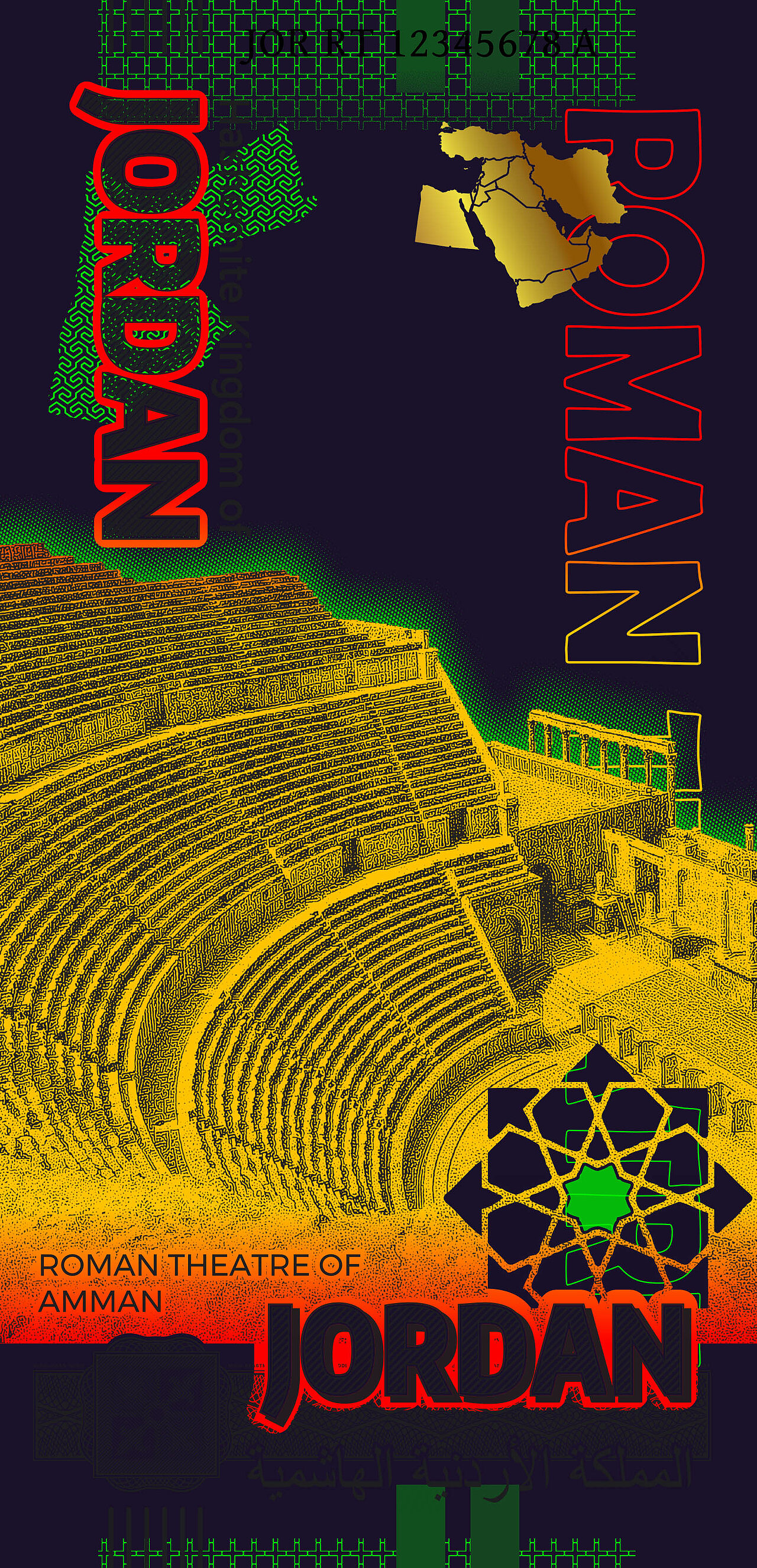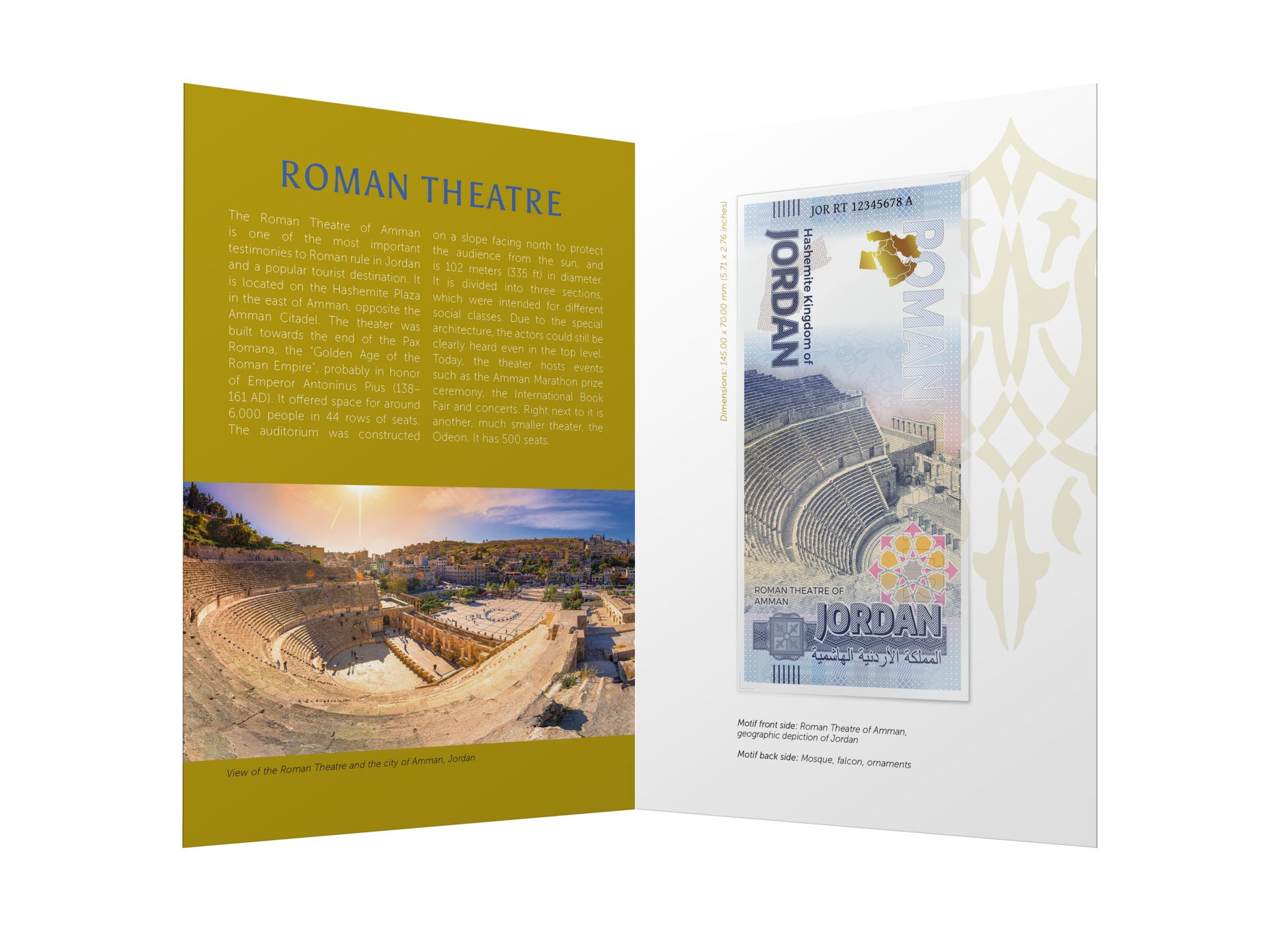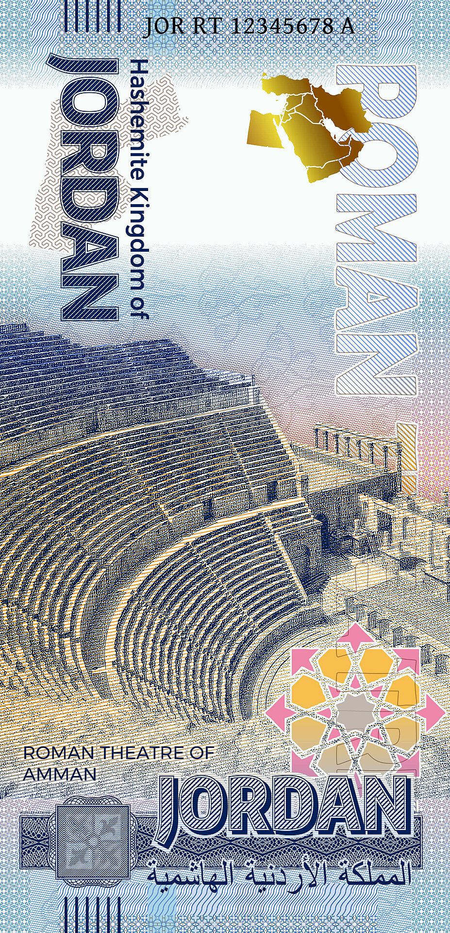 This unique souvenir note from the Middle East Series is dedicated to Jordan's famous historical heritage. It is printed on genuine banknote paper and has several modern security features such as a gold foil patch in the shape of a map of the Middle Eastern countries. The obverse is designed vertically and depicts the Roman Theatre of Amman. The reverse shows a mosque and a falcon, the traditional heraldic animal of several Arab states.