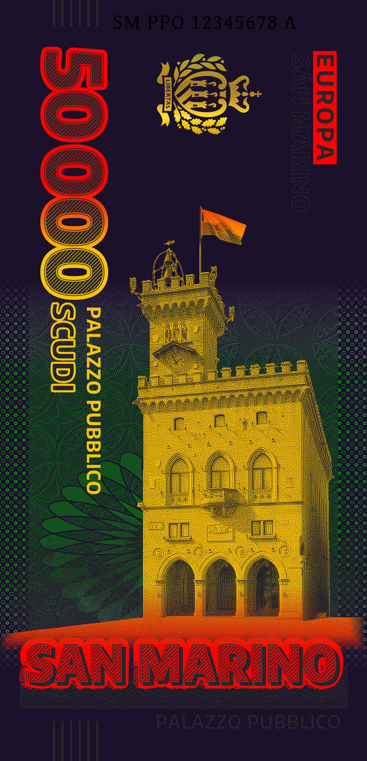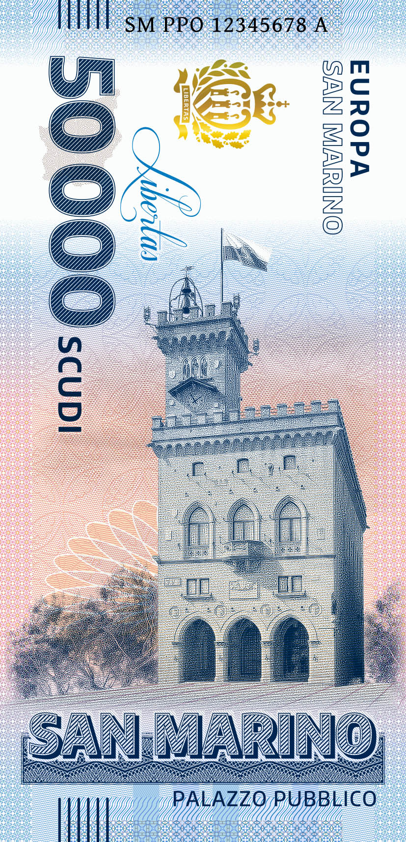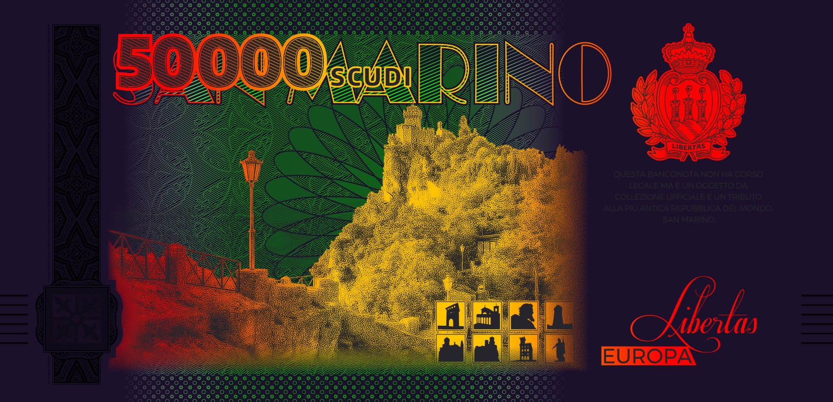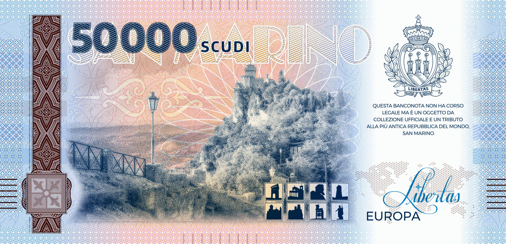 This unique souvenir note from the San Marino Series was developed in cooperation with the Poste San Marino and is dedicated to the Palazzo Pubblico. It is printed on genuine banknote paper and has several modern security features such as UV ink and a gold foil patch in the shape of a coat of arms of San Marino. The obverse is designed vertically and depicts the Palazzo Pubblico. The horizontal reverse shows a view of the Second Tower and the “Witches' Pass” (Passo delle Streghe). The path that runs between the fortifications on Mount Titano owes its name to old stories about young women who are said to have gathered on the mountain to dance around bonfires. The San Marino Series, which comprises a total of eight souvenir notes, is also available in a booklet with lots of information and pictures.
