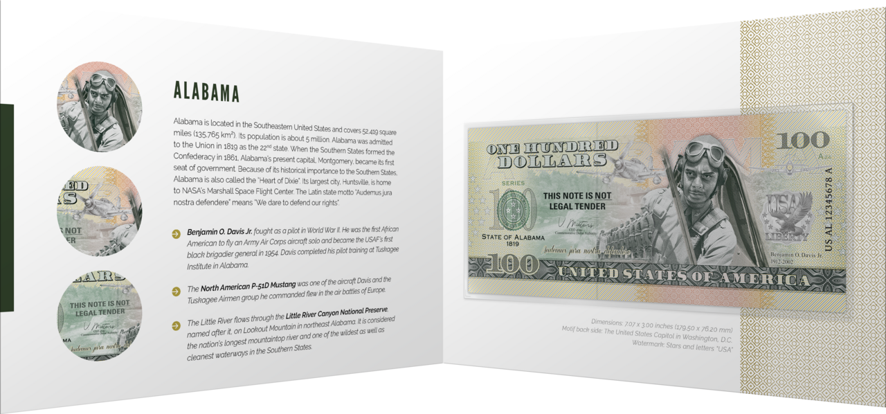 During World War II, Benjamin O. Davis Jr. participated in the air battles of Europe as a fighter pilot. He was the first African-American to fly an Army Air Corps aircraft solo and became the first black brigadier general in the U.S. Air Force in 1954. Davis completed his pilot training at Tuskagee Institute in Alabama. This note of the 50 U.S. States Program depicts him in his cockpit, a North American P-5ID Mustang fighter aircraft, a photo of Major James A. Ellison reviewing the first class of Tuskegee Airmen cadets in 1941, Little River in Little River Canyon National Preserve on Lookout Mountain, Alabama's motto "Audemus jura nostra defendere" (Lat. for "We dare to defend our rights") and the year of admission to the Union.