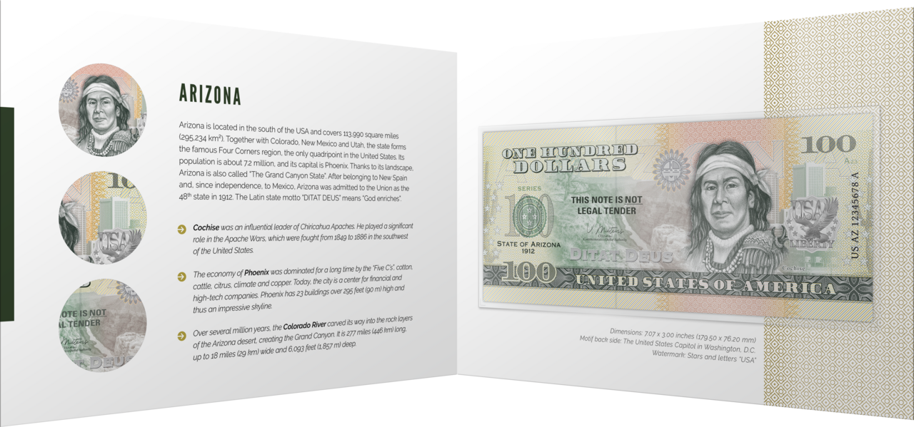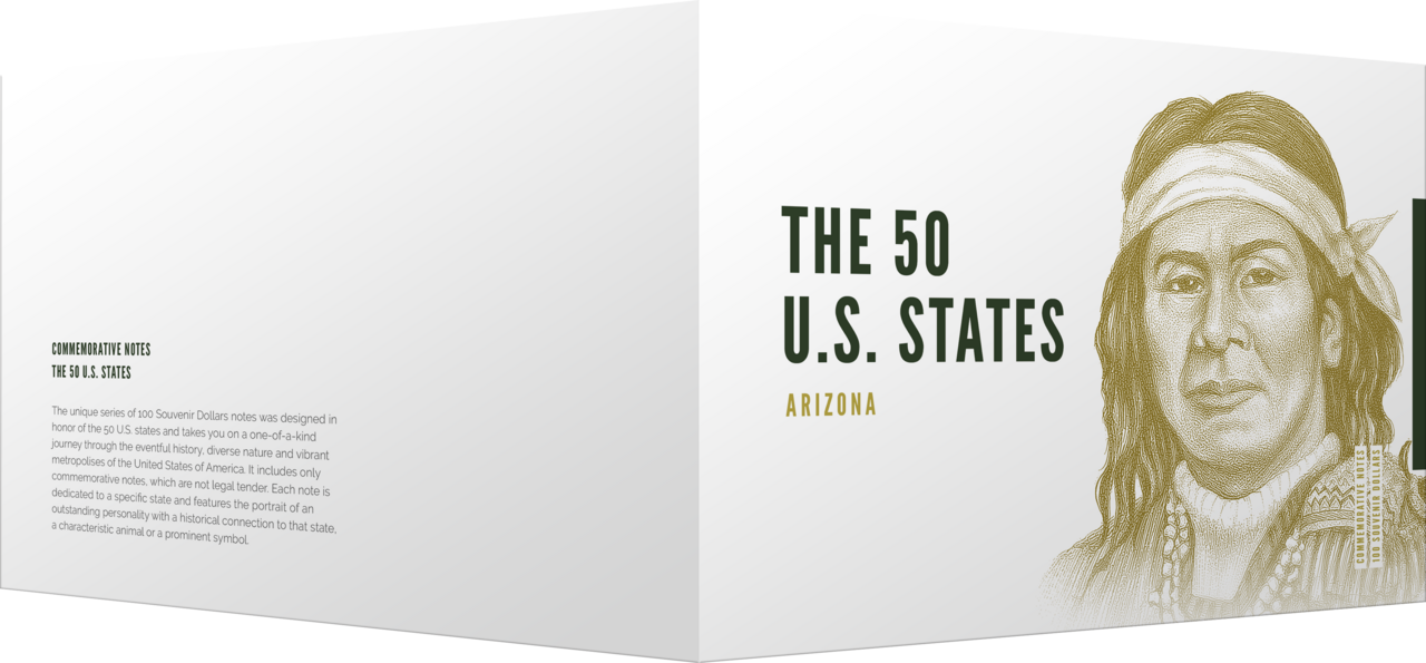 From 1849 to 1886, the southwest of the present-day United States, including Arizona, was dominated by the Apache Wars between the U.S. Army and various tribal groups. One of the most significant figures of the conflicts was Cochise, leader of Chiricahua Apaches. A portrait of the influential chief is featured on this note from the 50 U.S. States Program. In addition, the note shows a depiction of the Grand Canyon, the skyline of Phoenix, the tree-like saguaro cactus, native American ornaments, Arizona's motto "DITAT DEUS" (Latin for "God enriched") and the year of admission to the Union.
