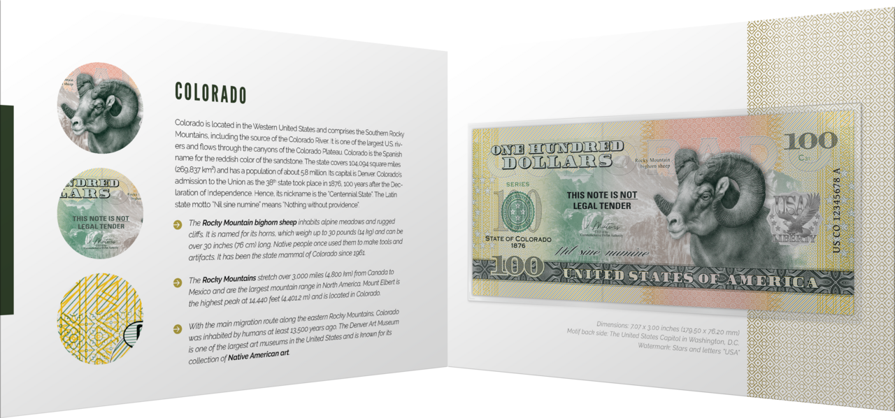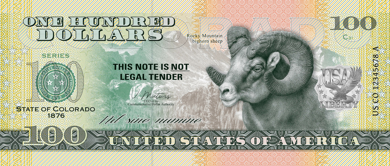 The Rocky Mountains bighorn sheep is the state mammal of Colorado. It inhabits alpine meadows and rugged cliffs of North America's largest mountain range. The sheep is named for its horns, which weigh up to 14 kilograms and are over 80 centimeters long. They were once used by Native Americans to make tools or ceremonial artifacts. This note from the 50 U.S. States Program features a bighorn sheep, a landscape in the Rocky Mountains, an American Native pattern, the state motto "Nil sine numine" (Latin for "Nothing without providence") and the year of admission to the Union.
