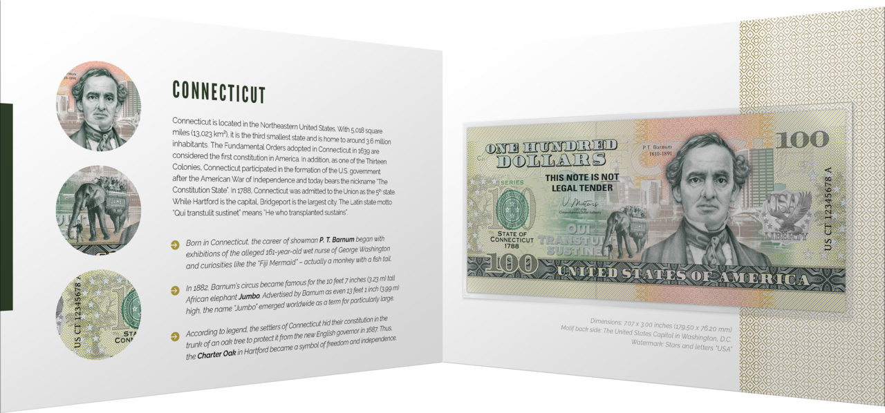 Born in Connecticut, P. T. Barnum began his career with exhibitions of the alleged 161-year-old wet nurse of George Washington and a variety of curiosities, such as the "Fiji Mermaid" – actually a monkey torso with a fish tail – or the fake remains of a petrified man presented as the "Cardiff Giant". His circus became world-famous in 1882 with the almost 3.5 meter tall elephant Jumbo. This note from the 50 U.S. States Program depicts a portrait of the circus pioneer, a drawing of Jumbo, the Hartford skyline, the Charter Oak in Hartford, Connecticut's map and motto "OUI TRANSTULIT SUSTINET" (Latin for "He who transplanted sustains"), and the year of admission to the Union.