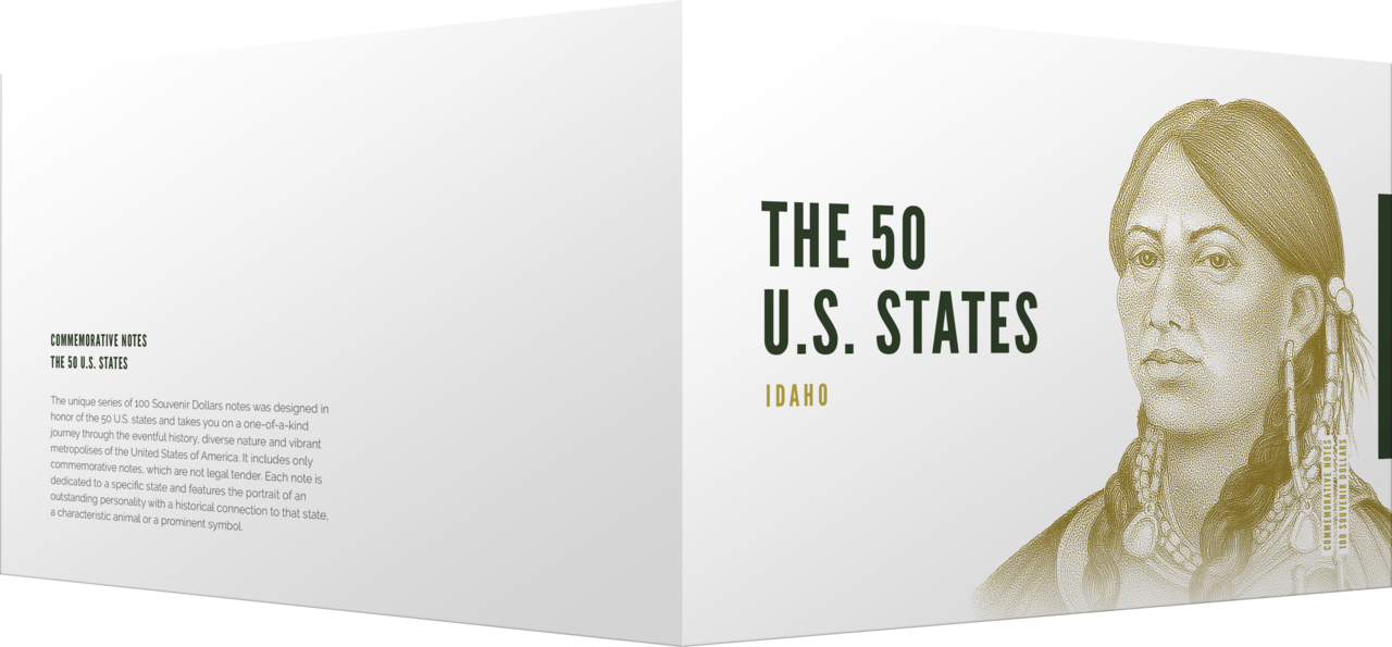Sacagawea is not only one of the most famous figures in American history but also a symbol for women's independence. A native of the Lemhi Shoshone tribe, she accompanied the Lewis and Clark Expedition from North Dakota to the Pacific Coast in 1805, contributing to the natural history exploration of the Americas and establishing cross-cultural contacts. This note from the 50 U.S. States Program depicts a portrait of Sacagawea, a landscape in the Frank Church-River of No Return Wilderness Area, Lewis' mock-orange flowers, the Boise skyline, Idaho's motto "Esto perpetua" (Latin for "Let it be perpetual") and the year of admission to the Union.