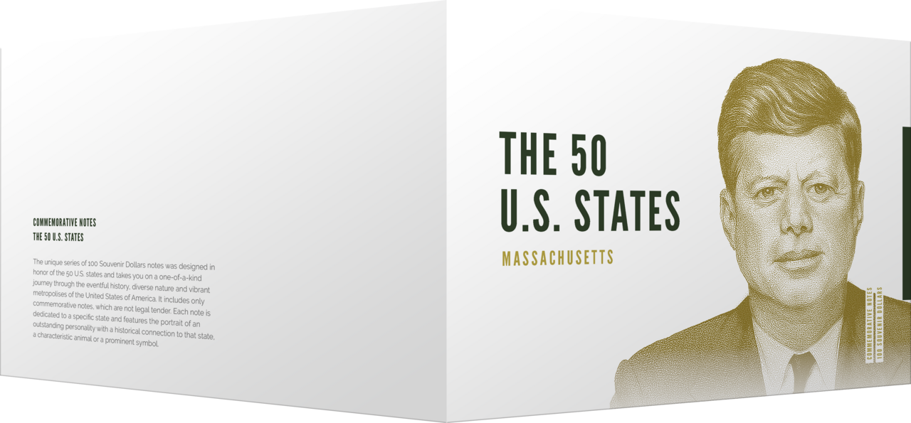 Before becoming U.S. president, John F. Kennedy was already known as a war hero after saving the life of a comrade in the Pacific during World War II. In 1961, at age 43, he was the youngest president elected to office in U.S. history. Born in Massachusetts, Kennedy died by assassination in 1963. This note from the 50 U.S. States Program depicts JFK, his brothers Robert and Edward, a Minutemen statue, the Massachusetts seal, the Boston skyline, Costom House Tower, the state motto "Ense petit placidam sub libertate quietem," (Latin for "By the sword we seek peace, but peace only under liberty") and the year of admission to the Union.
