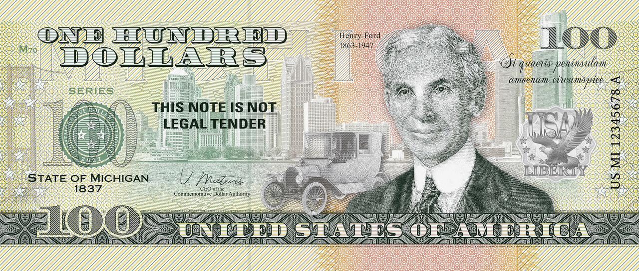 Michigan-born Henry Ford founded the Ford Motor Company in 1903 and revolutionized the automobile industry through the assembly line manufacturing process he perfected. With the combination of cheaper goods, higher wages and more leisure time, he was instrumental in creating the modern consumer society. The Ford Model T, produced from 1908 to 1927, was the first car in history to be affordable for the middle class. This note of the 50 U.S. States Program depicts a portrait of Ford, a Ford Model T, the Detroit skyline, the Mackinac Brigde, the Latin state motto "Si quaeris peninsulam amoenam circumspice" (If you seek a pleasant peninsula, look around you.) and the year of admission to the Union.