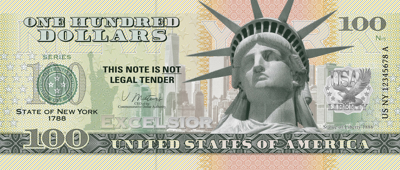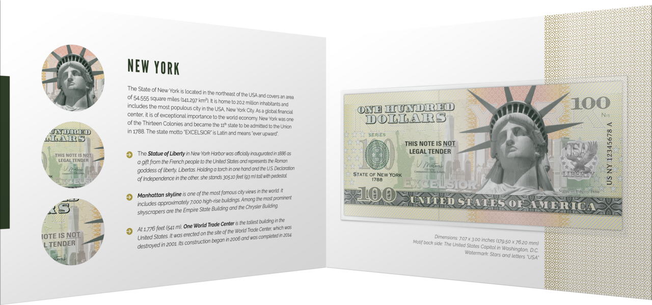 The Statue of Liberty in New York Harbor is undoubtedly one of the most famous sculptures in the world and has been a UNESCO World Heritage Site since 1984. It was designed by Frédéric Auguste Bartholdi and inaugurated in 1886 as a gift from the French people to the United States. Representing the Roman goddess of liberty, Libertas, the figure holds a torch in one hand and the U.S. Declaration of Independence in the other. This note from the 50 U.S. States Program depicts the head and a shadow outline of the Statue of Liberty, the Manhattan skyline, New York's motto "EXCELSIOR" (Latin for "ever upward") and the year of admission to the Union.