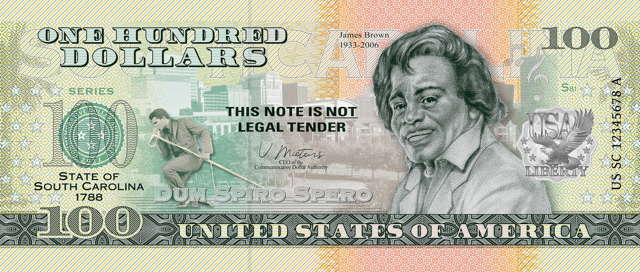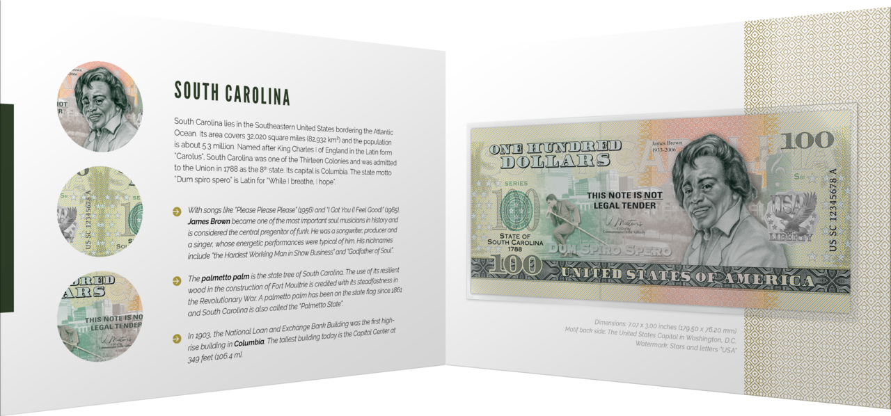 With songs like "Please Please Please" (1956) and "I Got You (I Feel Good)" (1965), South Carolina-born James Brown became one of the most important soul musicians in history and is considered the major pioneer of funk music. He was a singer, songwriter and a producer and was among the first 10 artists inducted into the Rock and Roll Hall of Fame. This note of the 50 U.S. States Program shows his portrait, a depiction of Brown performing, the Columbia skyline, a palmetto palm tree, the state motto "DUM SPIRO SPERO" (Latin for "While I breathe, I hope") and the year of admission to the Union.